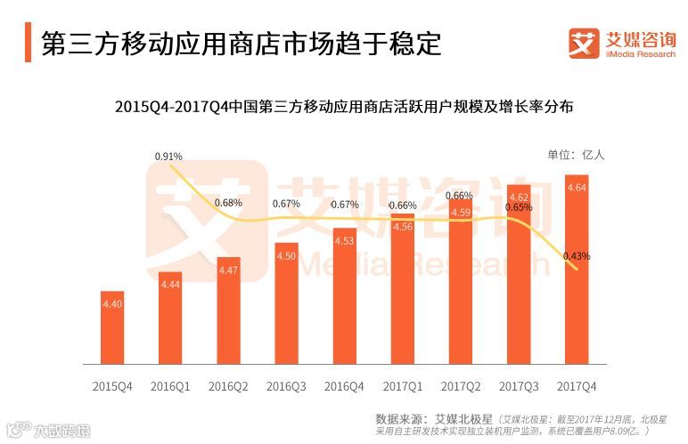 摘要:艾媒咨询数据显示,截至2017年第四季度,我国第三方移动应用商店活跃用户达4.64亿人。调查显示,超四成受访用户愿意将来为手机应用下载付费,而在不同的付费应用类别中,最受用户青睐的是手机游戏,27.4%的用户愿意为该类别应用下载付费,其次是影音播放和考试学习类应用。艾媒咨询分析师认为,免费下载仍是中国移动应用市场的主流,依靠广告或类似方式盈利依然会是主要渠道。