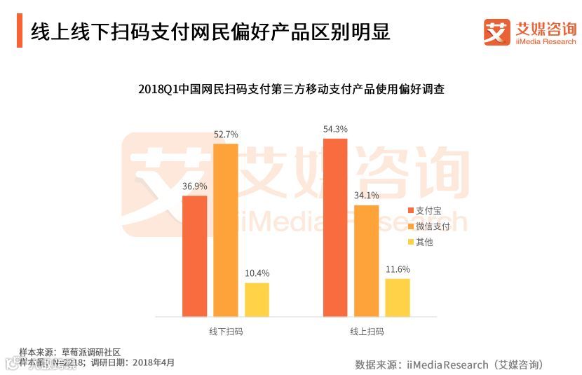 iiMedia Research(艾媒咨询)数据显示,2018年第一季度,在线下扫码支付中倾向使用微信支付的受访网民占52.7%,倾向使用支付宝支付的受访网民占36.9%。在线上扫码支付中倾向使用支付宝的受访网民占56.3%,倾向使用微信支付的受访网民占32.1%。艾媒咨询分析师认为,网民线下日常扫码支付时,微信支付内嵌微信更具便捷优势,而线上场景支付宝得益阿里电商优势,偏好使用用户更多。