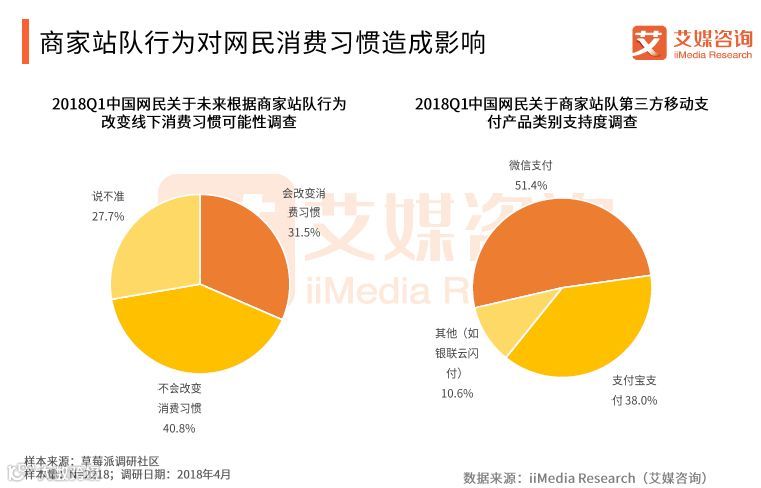 iiMedia Research(艾媒咨询)数据显示, 2018年第一季度,有31.5%的受访网民会因为商家站队行为改变自身消费习惯,40.8%的受访网民不会改变。在商家站队支付产品趋势下,希望商家站队微信支付和支付宝的受访网民分别占51.4%和38.0%。艾媒咨询分析师认为,较多受访网民会因为商家的站队行为改变消费习惯,是否选择站队、站队何种支付产品将成为商家的重要考量。