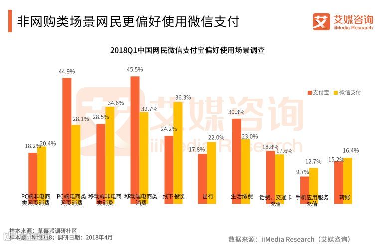 iiMedia Research(艾媒咨询)数据显示,2018年第一季度,线上非电商类小额支付中倾向使用支付宝的受访网民占35.3%,倾向使用微信支付的受访网民占61.6%。艾媒咨询分析师认为,微信扫一扫功能已经成为用户进行二维码扫描时的优先选择,结合微信支付自身在小额支付方面的便利性,微信支付在线上非电商类小额支付中占据更多优势。