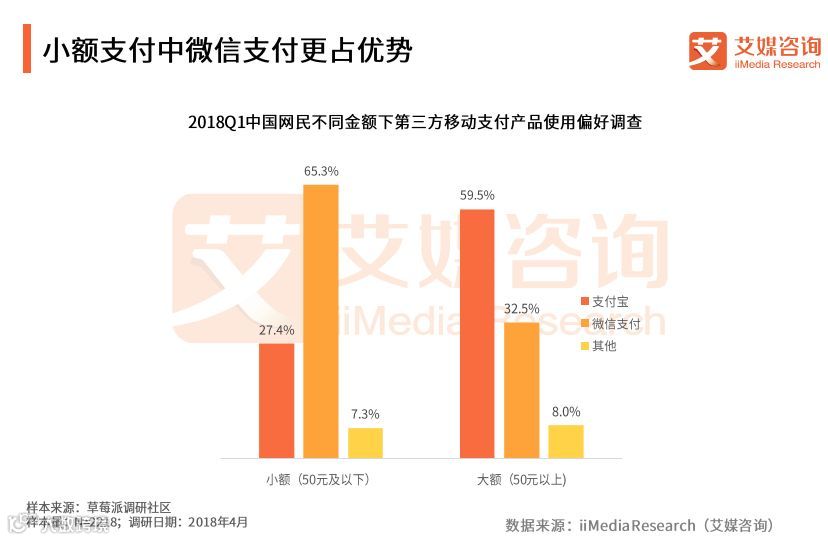 iiMedia Research(艾媒咨询)数据显示, 2018年第一季度,小额支付中倾向使用支付宝的受访网民占27.4%,倾向使用微信支付的受访网民占65.3%。在大额支付中倾向使用支付宝的受访网民占59.5%,倾向使用微信支付的受访网民占32.5%。艾媒咨询分析师认为,由于使用惯性网民在支付时更多选择支付宝。但微信支付凭借自身社交性和便利性在小额支付中更占优势,随着消费观念的转变,在大额支付和扫码支付场合微信的地位或将进一步提升。