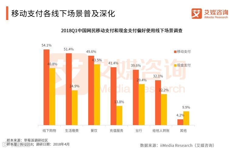 iiMedia Research(艾媒咨询)数据显示,2018年第一季度,受访网民移动支付偏好的使用线下场景中购物和生活缴费分别以54.1%和51.4%的比例占据第一和第二位,受访网民在餐饮、充值服务、出行、给他人转账等场景使用第三方移动支付偏好也均高于三成。另一方面,受访网民在餐饮和线下购物场景偏好使用现金支付的占比较高,分别为43.5%和40.8%。