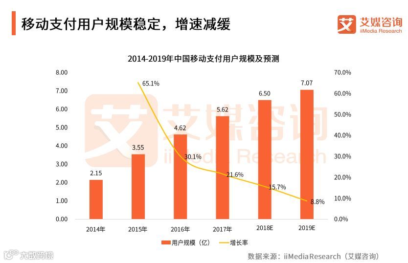 iiMedia Research(艾媒咨询)数据显示,2017年中国移动支付用户规模达5.62亿人,较2016年增长21.6%。预计2018年移动支付用户规模增长减缓,累计用户规模有望达6.50亿人。艾媒咨询分析师认为,经历发展初期用户规模迅猛发展后,中国移动支付市场趋于成熟,用户规模增速开始减缓,预测未来中国移动支付用户规模将保持低速稳定增长。