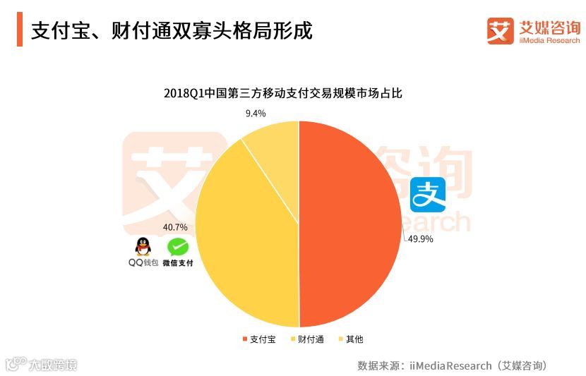 iiMedia Research(艾媒咨询)数据显示,2018年第一季度支付宝与财付通两大巨头占据中国第三方移动支付交易规模市场份额的90.6%,市场集中度高。艾媒咨询分析师认为,中国第三方移动支付市场进入成熟期,支付宝、财付通双寡头市场格局已经形成。虽然财付通发展晚于支付宝,但微信支付凭借其社交属性获得更多用户青睐,整体市场交易规模占比紧跟支付宝。随着国家对互联网金融安全日益重视,银联推出云闪付APP,其制度优势会对财付通和微信支付造成一定冲击。
