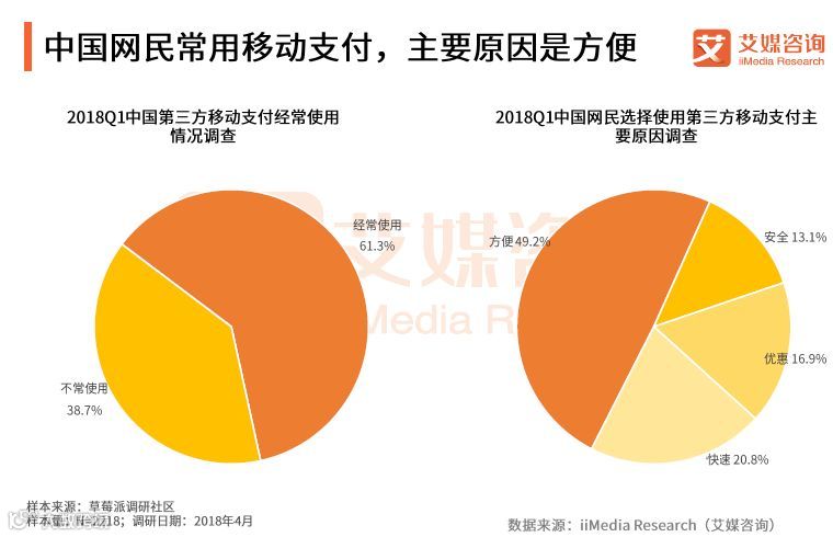 iiMedia Research(艾媒咨询)数据显示, 2018年第一季度,经常使用第三方移动支付的中国受访网民占比高达61.3%,不常使用移动支付的受访网民仅占38.7%。其中,方便是中国网民选择第三方移动支付的主要原因,占比达49.2%。艾媒咨询分析师认为,第三方移动支付凭借方便、快速等优势迅速扩大普及情况,改变网民日常消费支付习惯。
