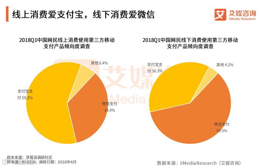 iiMedia Research(艾媒咨询)数据显示, 2018年第一季度,当所有支付方式都可以选择时,线上消费中倾向使用支付宝支付和微信支付的受访网民占比分别是59.2%和34.4%;线下消费中倾向于使用微信支付的受访网民占59.5%。艾媒咨询分析师认为,阿里线上电商优势明显,支付宝更受网民线上消费青睐,但线下消费场景中,微信优势逐渐显现。