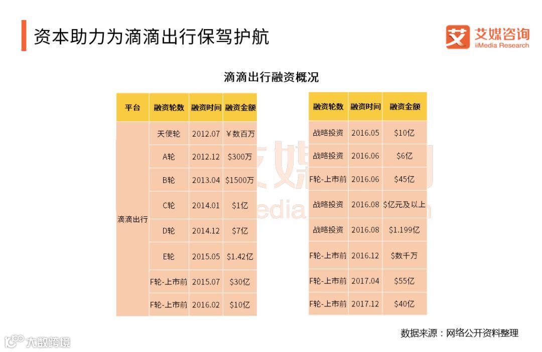 2012年滴滴出行首次获天使轮投资的数百万元,2017年底滴滴出行再次获得融资40亿美元,资本总量呈上升趋势。艾媒咨询分析师认为,资金的走向着眼于市场发展的巨大潜力。一方面,随着行业规范化发展,未来资本方对其关注度仍会不断提升。另一方面庞大的资金支持系统让出行行业进行快速资源整合,促使规模经济形成,降低原始成本,实现资源的合理利用和优化配置。