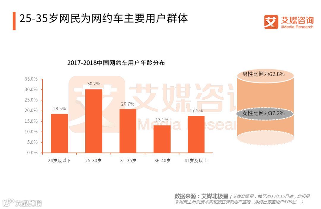 iiMedia Research(艾媒咨询)数据显示,25-30岁的网约车用户比例最高,占总体用户30.2%,25-35岁的网约车用户所占比例为50.9%。在性别上,男性用户比例高于女性用户比例。艾媒咨询分析师认为,网约车用户的年龄区间分布和用户的经济能力和接受新事物能力相关,25-35岁的用户群体消费习惯容易养成且经济实力较好,成为网约车用户的主力军。