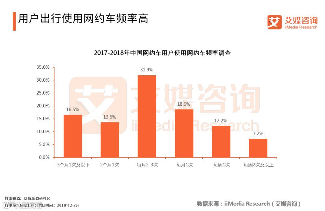 iiMedia Research(艾媒咨询)数据显示,每月使用2-3次的网约车用户所占比例最高(31.9%),每月使用2-3次及其以上的用户所占比例之和为69.9%,对网约车高度依赖(每周2次及以上)的用户比例占7.2%。艾媒咨询分析师认为,中国网约车用户的消费习惯逐渐养成,小部分用户消费习惯已成熟。但从整体来看,部分用户习惯养成还处于开始阶段,消费动力并未完全被激发,网约车行业未来仍有较大发展潜力。