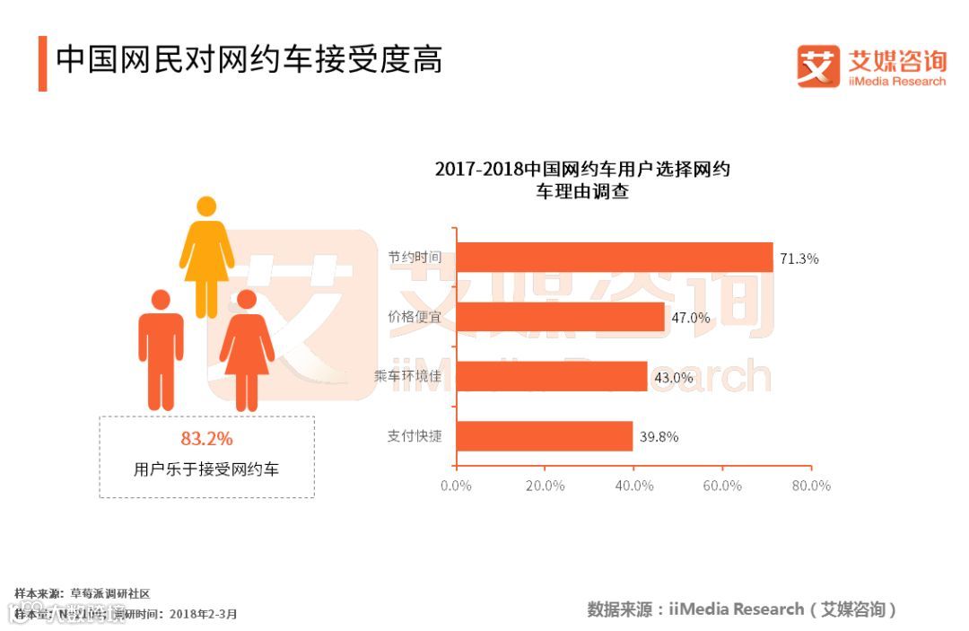 iiMedia Research(艾媒咨询)数据显示,2017-2018年在中国出行市场中,超八成的用户乐于接受使用网约车出行。关于选择使用网约车出行的原因调查中,71.3%的网约车用户为了节约时间而使用网约车出行,更为优惠的价格(47.0%)以及更佳的乘车环境也是用户选择网约车出行的重要原因。