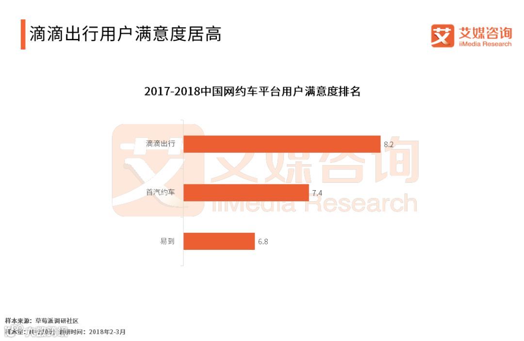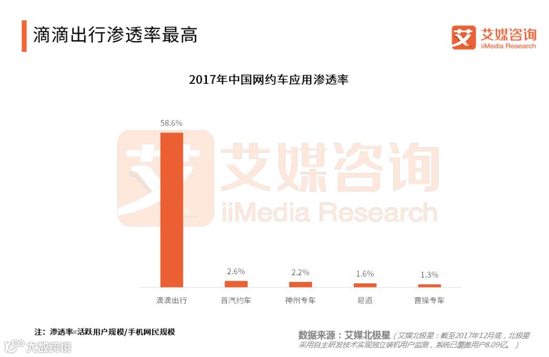 iiMedia Research(艾媒咨询)数据显示,2017年滴滴出行以58.6%的渗透率位居各平台之首,远超其他网约车平台。艾媒咨询分析师认为,目前网约车出行市场中滴滴出行具有绝对的领导地位,而滴滴出行长久建立起来的知名度和品牌优势更获用户信任,也成为人们网约车出行主要选择平台。