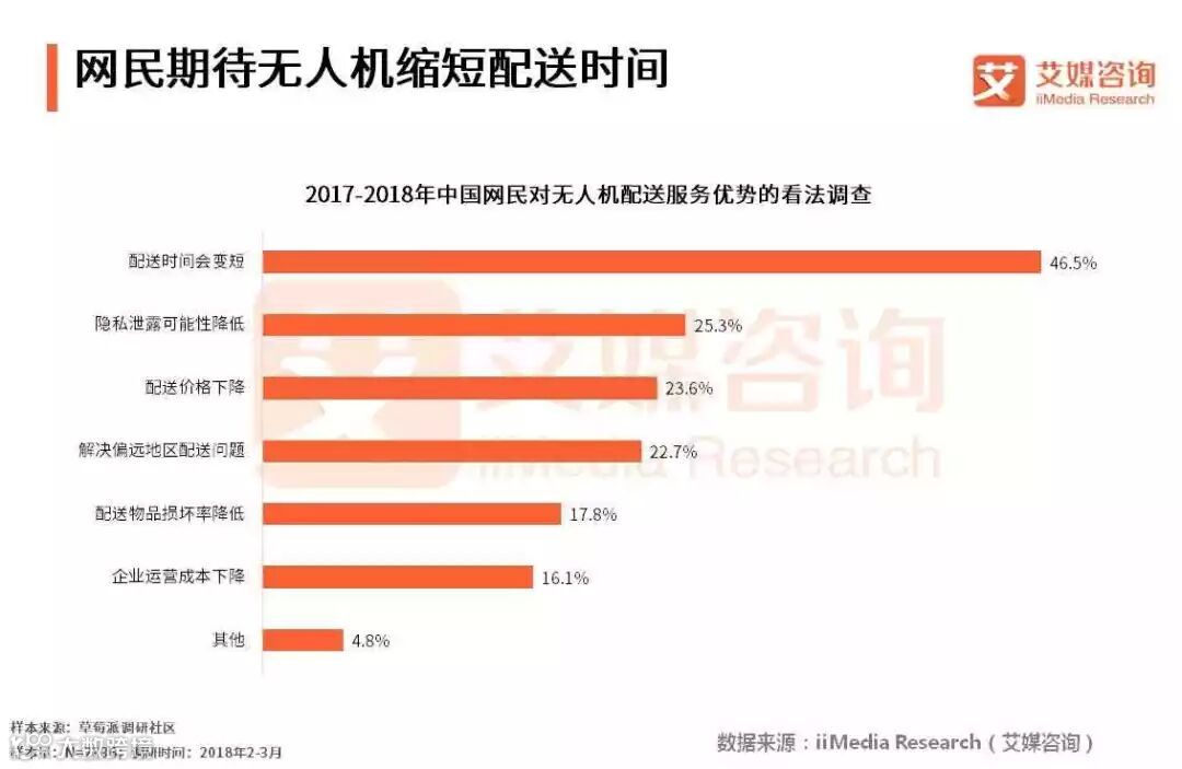 iiMedia Research(艾媒咨询)数据显示,46.5%的受访网民认为无人机会缩短配送时间,25.3%的受访网民认为无人机会降低隐私泄漏的可能性。艾媒咨询分析师认为,无人机在配送时间上被寄予厚望。无人机配送具有高效、缓解人力资源紧张等优势,在解决偏远地区配送问题上具有较强的优势。