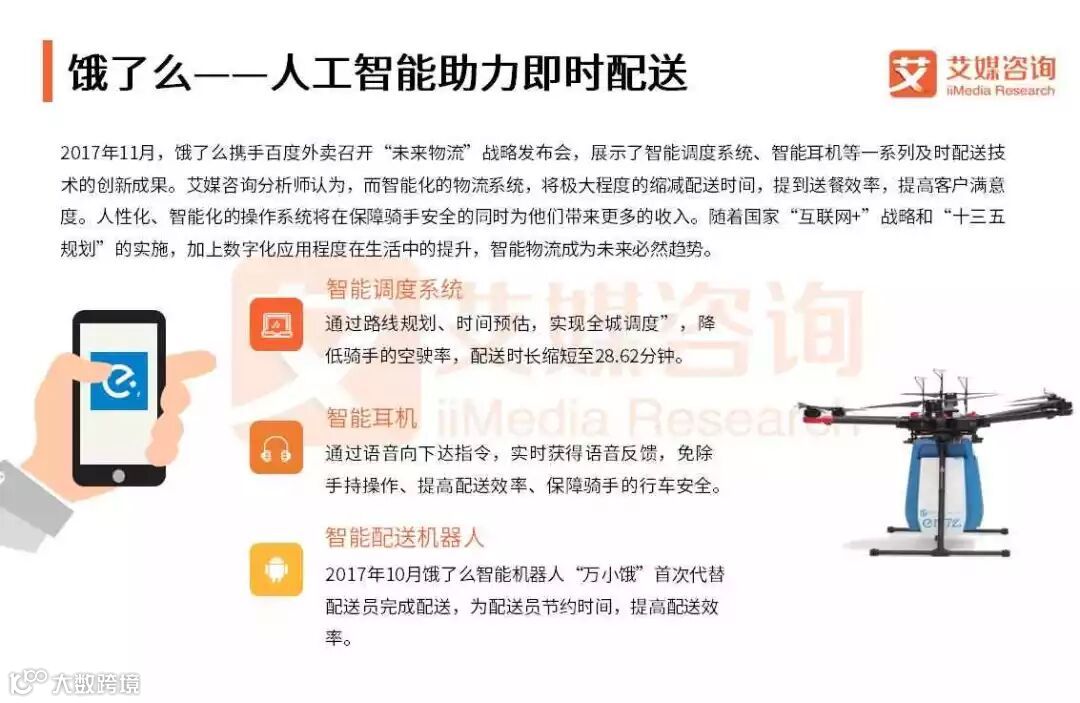 艾媒咨询分析师认为,随着算法的不断优化,即时配送平台通过大数据整合商家和用户信息,精确定位用户属性,将为用户提供更准确的商品推荐等服务,优化用户体验。人工智能调度系统可以在最短的时间内寻找配送最优组合,优化资源配置,提高配送效率,减少用户等待时间。机器人、无人机等新型工具的应用,将缓解人力资源的紧张状态,拓展即时配送物流体系。