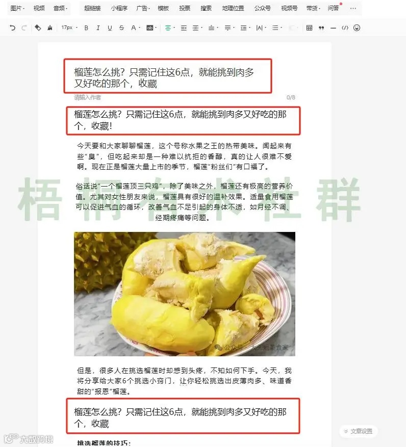 3、账号垂直度。如果你的公众号平时更新的都是家具相关的内容,突然有一天更新了一篇“如何挑榴莲”的文章,那么你的排名就会没有人家专门写水果专门写榴莲的文章的排名高,因为人家的账号垂直,发的内容自带粉丝点击,每次点击都会带来额外权重,所以,垂直度越高的账号,文章排名自然也就越高。