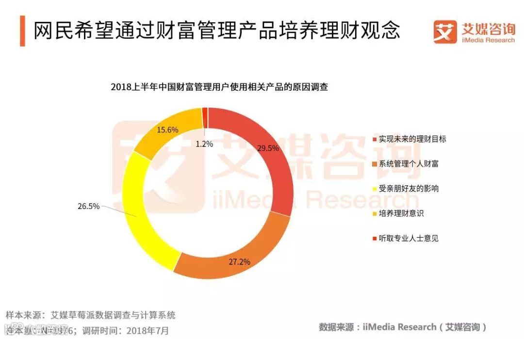 iiMedia Research(艾媒咨询)数据显示,29.5%的用户因想实现未来理财目标而选择财富管理产品,有27.2%的受访用户则希望系统化管理个人财富。艾媒咨询分析师认为,理财观念的普及使越来越多的网民开始尝试对个人财富进行规划管理,而互联网技术发展也为网民提供更为便捷的渠道接触财富管理产品实现自身理财目标。
