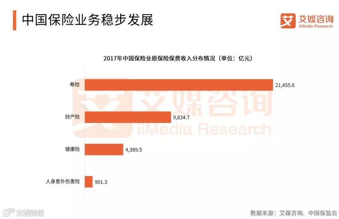 数据显示,2017年中国保险业原保险保费收入36581.1亿元。其中,寿险业务原保险保费收入21455.6亿元,健康险和人身意外伤害险业务原保险保费收入5290.8亿元,财产险业务原保险保费收入9834.7亿元。
