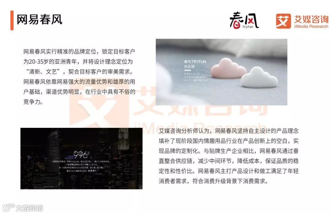 艾媒咨询分析师认为,在营销上杜蕾斯及网易春风是行业文案宣传的标杆。杜蕾斯公司始终能够精准把握社会热点,让其产品搭乘热点顺风车进行借势宣传,并依靠进入市场时间优势及通过多年公益活动扩大品牌声誉及社会影响力,引领性文化潮流,丰富线上线下销售渠道,稳固行业领先地位。而网易春风作为依托网易平台产生的情趣用品品牌,充分挖掘用户特点,精准定位,推出符合定位人群审美要求的宣传方案。另外,情趣用品行业潜在市场巨大、市场格局未定,网易春风背靠用户基础雄厚、产业链完善的网易平台,共享网易精品电商的经营经验及供应链整合,自主设计产品,保证产品的稳定性和质量,符合消费升级下消费者对产品的更高要求,有望在蓝海市场中异军突出,成为行业IP。