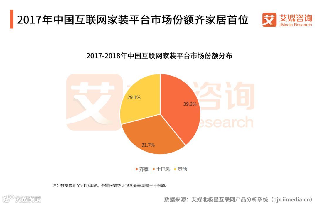 iiMedia Research(艾媒咨询)数据显示,2017年,齐家与土巴兔分别以39.2%与31.7%的市场份额在互联网家装平台中居前两名。