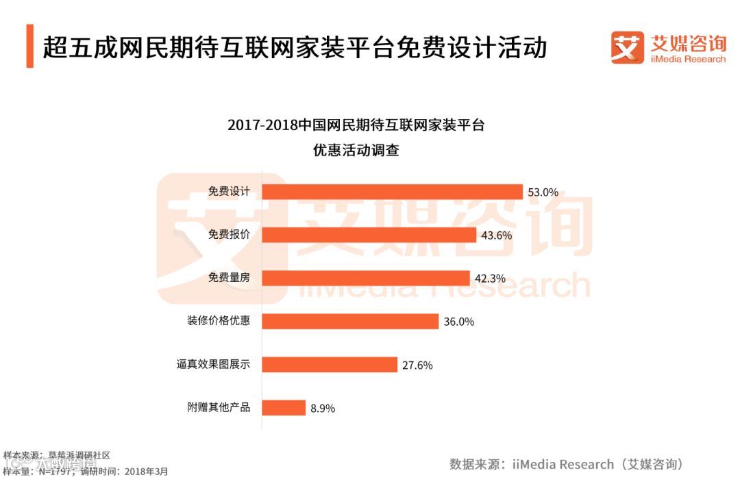 iiMedia Research(艾媒咨询)数据显示,53.0%的受访网民期待互联网家装平台能提供免费设计优惠活动,43.6%的受访网民期待免费报价。艾媒咨询分析师认为,消费者期待优惠活动多集中于家装前,通过部分免费服务能有助于互联网家装平台获取更多用户,同时扩大产品知名度。