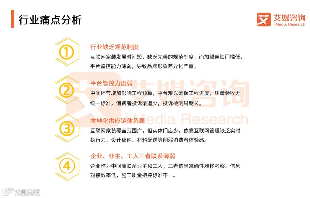 艾媒咨询分析师认为,虽然互联网家装市场发展潜力巨大,但行业发展仍在供应链体系、平台管控等方面存在不足。互联网家装行业入局门槛高,需要具有强综合实力的平台才有机会进一步开拓市场。