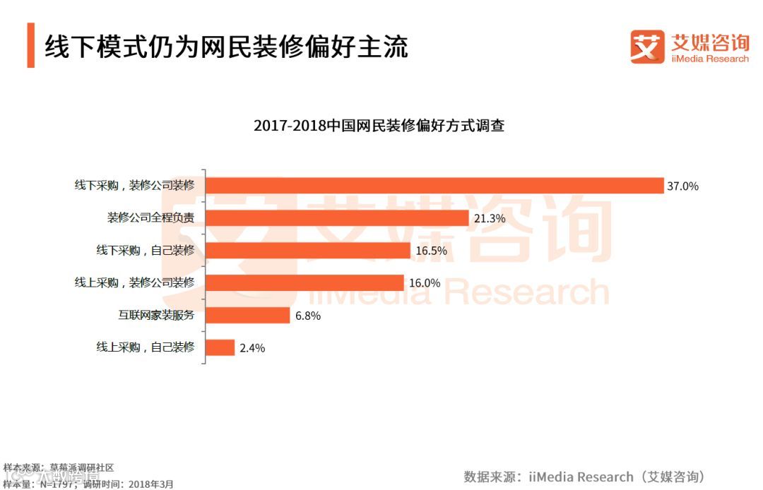 iiMedia Research(艾媒咨询)数据显示,37.0%的受访网民偏好使用线下采购,再交由装修公司装修的方式进行装修,而偏好装修公司全程负责装修以及线下采购并自己装修的受访网民占比也分别达到21.3%和16.5%。艾媒咨询分析师认为,虽然现阶段消费者使用传统线下采购及装修的观念较为牢固,但使用互联网的年轻用户偏多,互联网家装又受到年轻人喜爱,未来仍有很大发展空间。