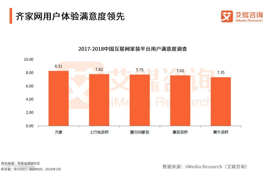 iiMedia Research(艾媒咨询)数据显示,齐家、土巴兔、爱空间家装位列前三,满意度分别达到8.31、7.82和7.75。艾媒咨询分析师认为,齐家网注重一站式家装平台打造,通过自身资源为用户提供更多产品和服务;除此之外,齐家网注重产品质量,第三方监理系统完善,因此在使用体验上更获用户认可。
