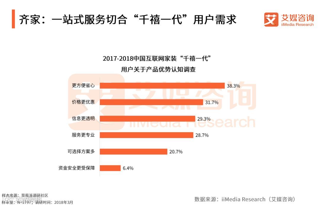 iiMedia Research(艾媒咨询)数据显示,38.3%的受访“千禧一代”用户认为相较于传统线下家装,互联网家装能使他们使用更为方便省心。艾媒咨询分析师认为,借助互联网技术发展,便捷成为“千禧一代”对互联网家装产品最认可的优势,而齐家凭借综合平台优势,从设计、供应链支撑到施工、售后等一站式服务最大程度上方便了用户家装流程,给予该部分用户较好的服务体验。随着“千禧一代”家装需求日益旺盛,提供一站式家装服务的齐家更切合其需求,在未来市场竞争中取得先机。