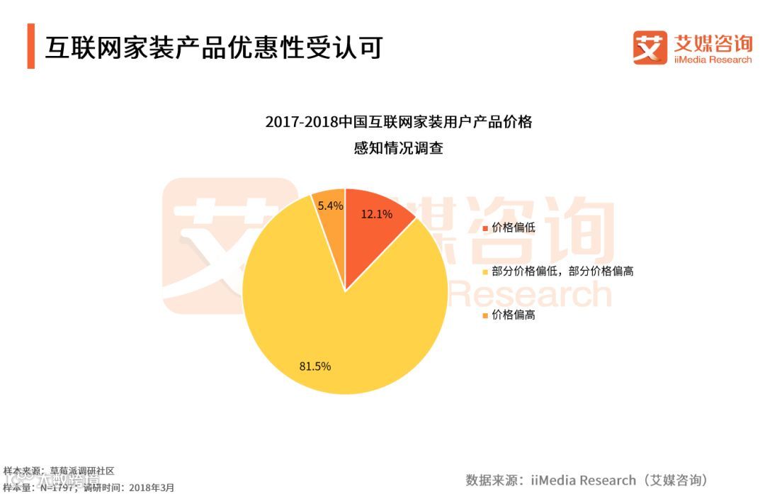 iiMedia Research(艾媒咨询)数据显示,对于互联网家装产品,12.1%的受访用户认为其价格偏低,认为部分产品价格偏低、部分产品价格偏高的用户达到81.5%,仅5.4%的用户认为产品价格偏高。艾媒咨询分析师认为,互联网家装产品通过压缩中间环节,信息更为透明,价格更实惠,同时平台整合更多家装资源也为用户提供更多优惠选择。