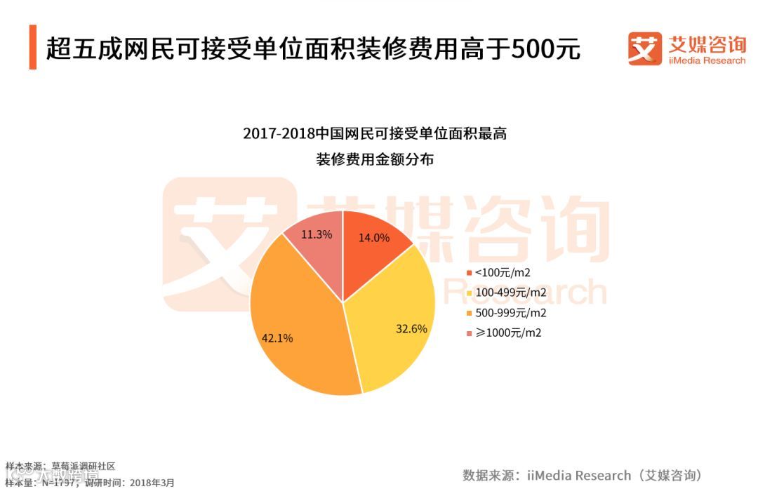 iiMedia Research(艾媒咨询)数据显示,53.4%的受访网民可接受单位面积最高装修费用在500元/m2以上,其中能接受500-999元/m2的受访网民占比为42.1%。艾媒咨询分析师认为,家装市场空间巨大,而消费者对其意愿消费金额处于中等水平,互联网家装行业的兴起能整合更多家装资源,提供相较线下传统家装行业更低的家装费用,更容易受到消费者青睐,未来发展前景值得期待。