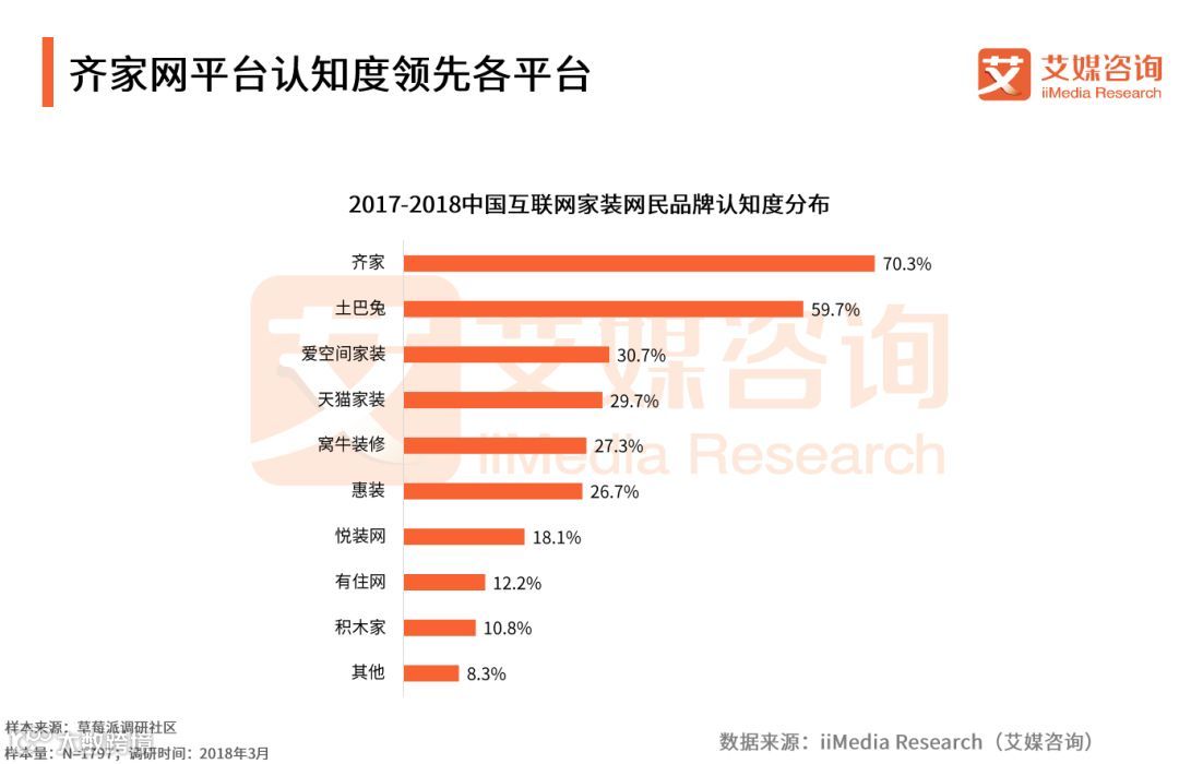 iiMedia Research(艾媒咨询)数据显示,在互联网家装品牌认知度方面,齐家以70.3%的网民认知度位列各平台之首,土巴兔(59.7%)与爱空间家装(30.7%)分列二三。艾媒咨询分析师认为,齐家网较早转型互联网家装平台发展,具备较强的用户基础,同时综合家装平台定位也为用户提供更完善的产品和服务,从而建立了良好口碑,品牌知名度较高。