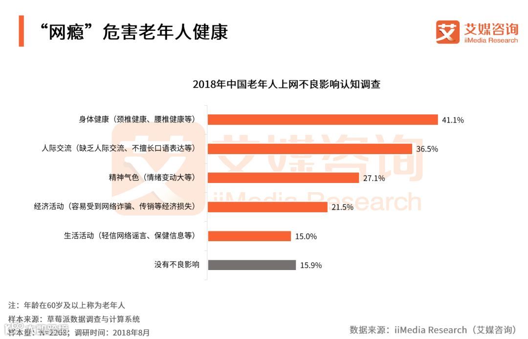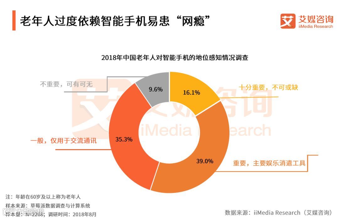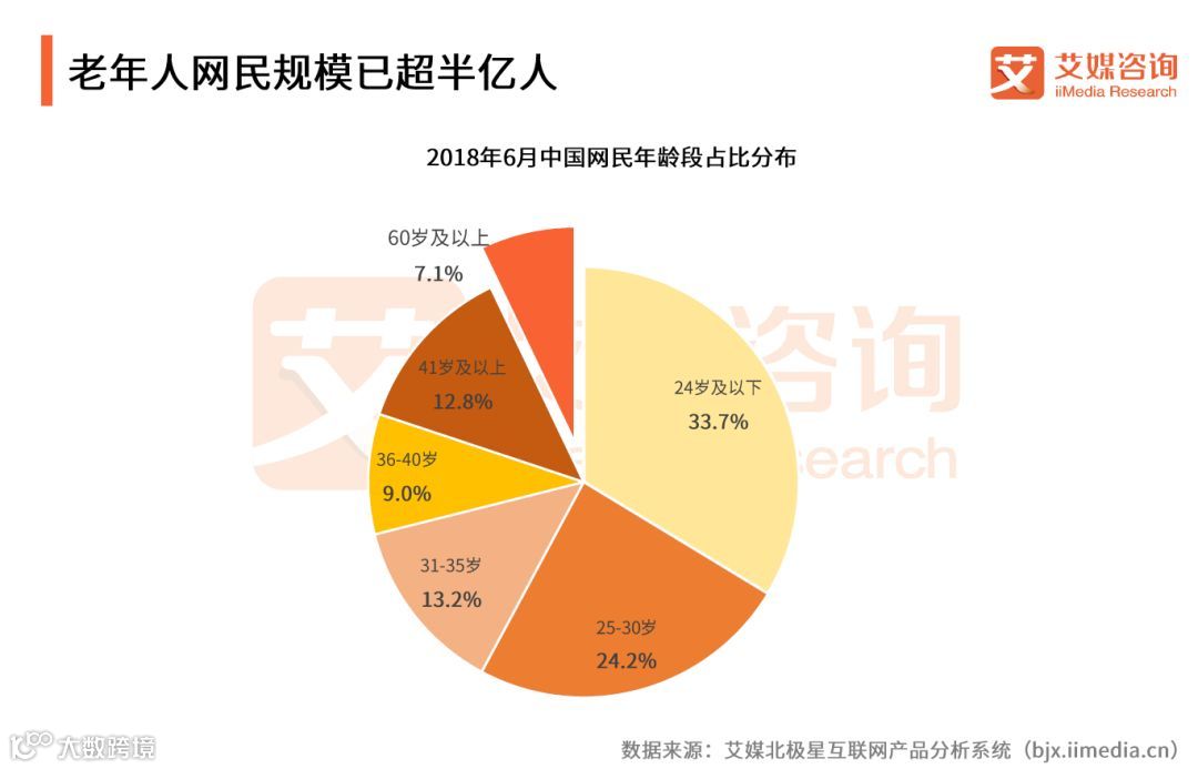 iiMedia Research(艾媒咨询)数据显示,2018年6月中国网民占比中,60岁及以上群体达7.1%,整体规模已超半亿人。艾媒咨询分析师认为,随着我国老龄人口比例逐渐扩大、互联网的普及和“空巢老人”等因素影响,越来越多的老年人希望通过网络与子女建立交流平台,缓解他们的寂寞孤单感,同时,网络上丰富的内容使得其开阔视野增长见识。多度依赖网络使得老年人“网瘾” 群体逐渐扩大。