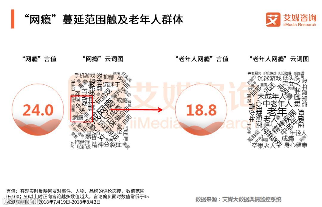 艾媒大数据舆情监控系统显示,“网瘾”云词图中出现“中老年”“老年人网瘾”云词图上也出现老年人因上网导致的相关疾病等。随着互联网的发展,网络也成为中老年人一种消遣方式。但随着对网络的过度依赖、“网瘾”的逐渐形成,网络逐渐在中老年人生活中“越位”,这也一定程度上折射出社会和子女对中老年人关爱的“缺位”。