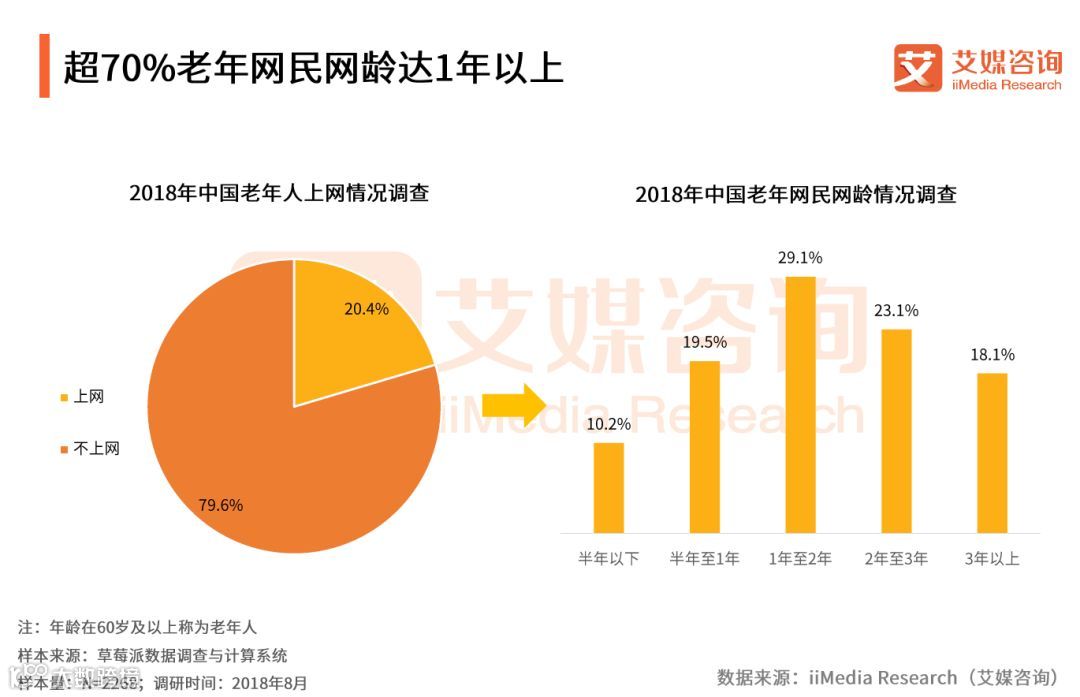 2018年8月20日,全球领先的新经济行业数据挖掘和分析机构iiMedia Research(艾媒咨询)权威发布《2018中国老年人“网瘾”热点监测报告》。“网瘾”不止是年轻人,老年人也会患“网瘾”。iiMedia Research(艾媒咨询)数据显示,老年人网民规模已超半亿人。尽管老年网民的“网龄”不长,但上网时间却不短,8.7%的老年网民日均上网时长超4小时。且老年网民最爱拼团爱剁手,近一成老年网民网上月花300元以上。在“60岁及以上网民购物类应用6月月活用户量”的统计中,拼多多占比3.9%,成为最受60岁以上老网民欢迎的购物APP。(《2018中国老年人“网瘾”热点监测报告》完整高清PDF版可点击文章底部阅读原文进行报告下载。)