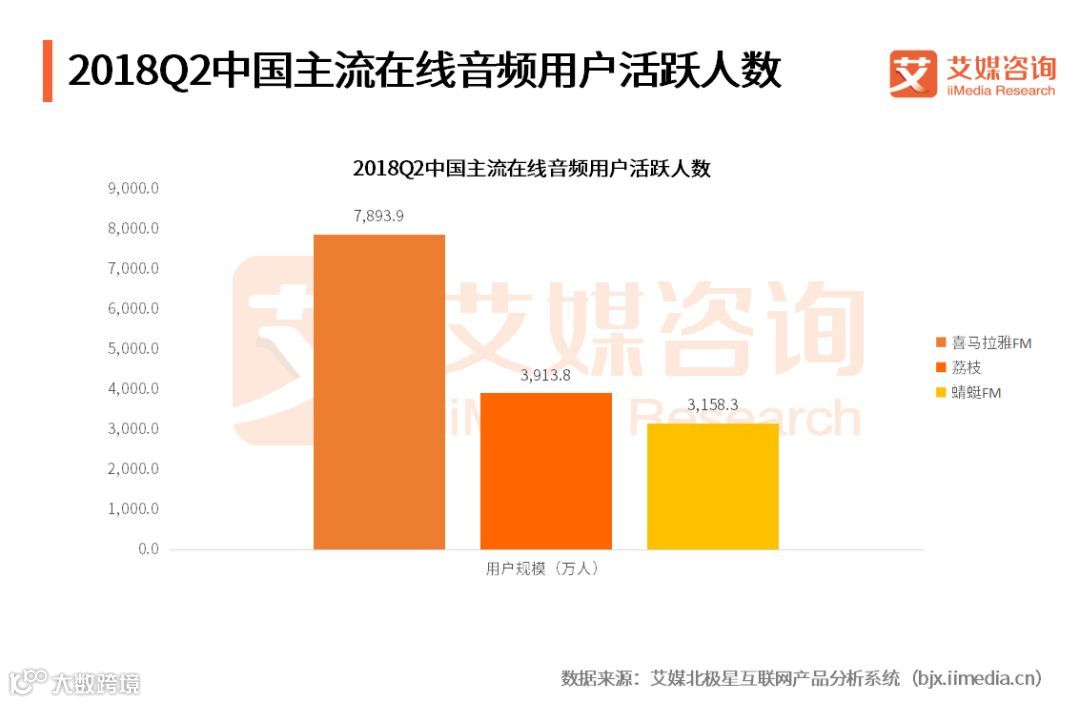iiMedia Research(艾媒咨询)数据显示,2018Q2喜马拉雅FM、荔枝和蜻蜓FM三家主流在线音频活跃人数分别达到7893.9万人、3913.8万人和3158.3万人。