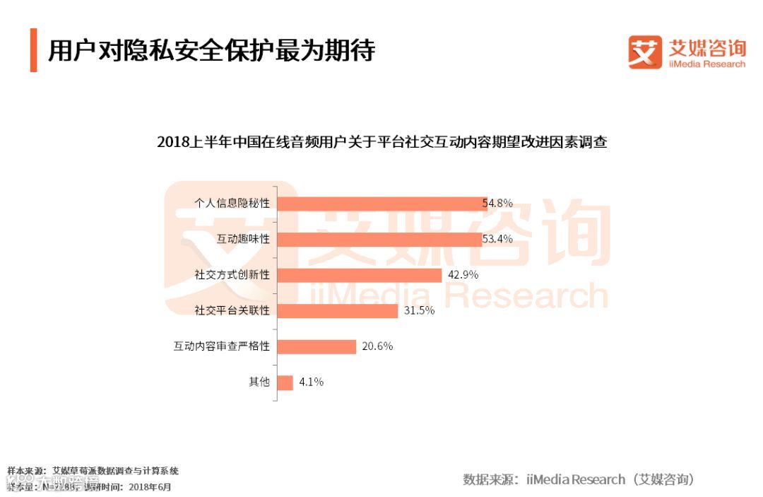 iiMedia Research(艾媒咨询)数据显示,受访在线音频平台用户对个人隐私的保护、互动的趣味性上最为期待,分别占比54.8%和53.4%。