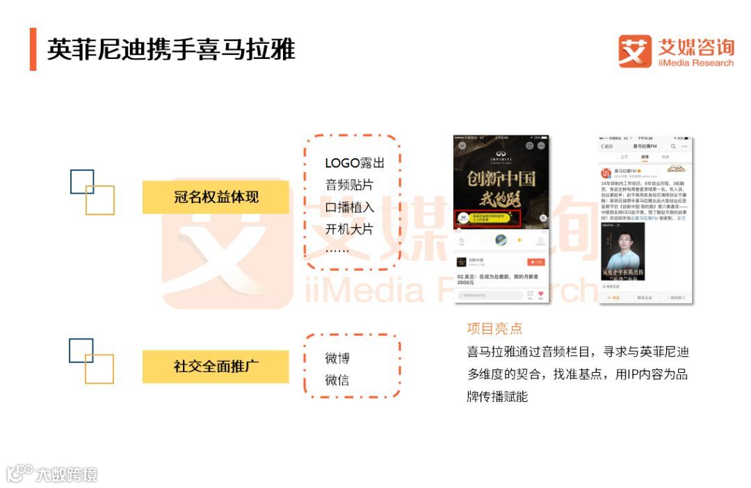 英菲尼迪携手喜马拉雅出品大型创业纪录音频节目《创新中国•我的路》,通过回顾16位互联网公司创始人的创业历程,展现他们坚持梦想初心,不被数字所限,突破自我成就更好的自己的过程。英菲尼迪与喜马拉雅多维度契合,共同传播《数字之上 成就更好的自己》的主题。