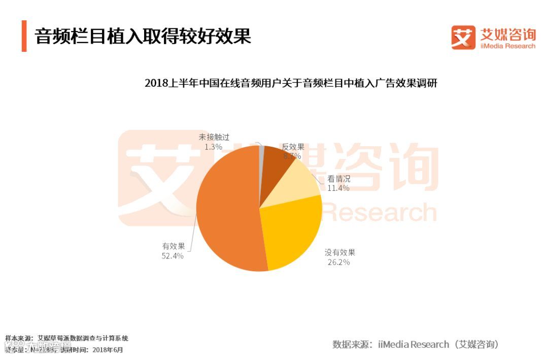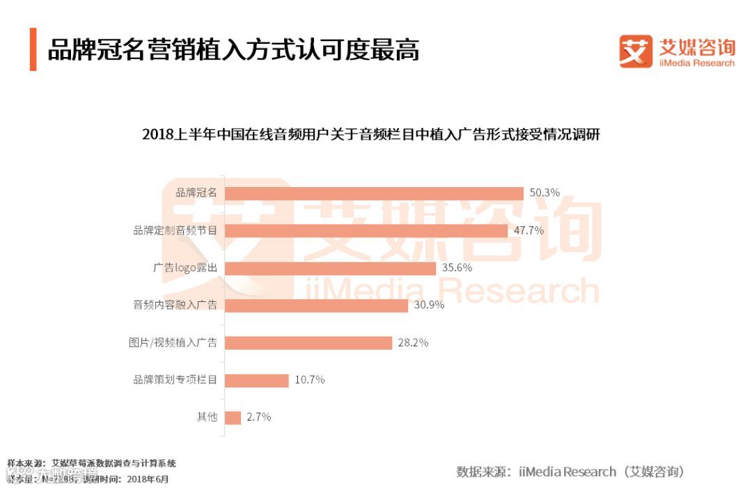 iiMedia Research(艾媒咨询)数据显示,超过一半的受访用户较能接受通过品牌冠名的方式在音频栏目中植入广告。