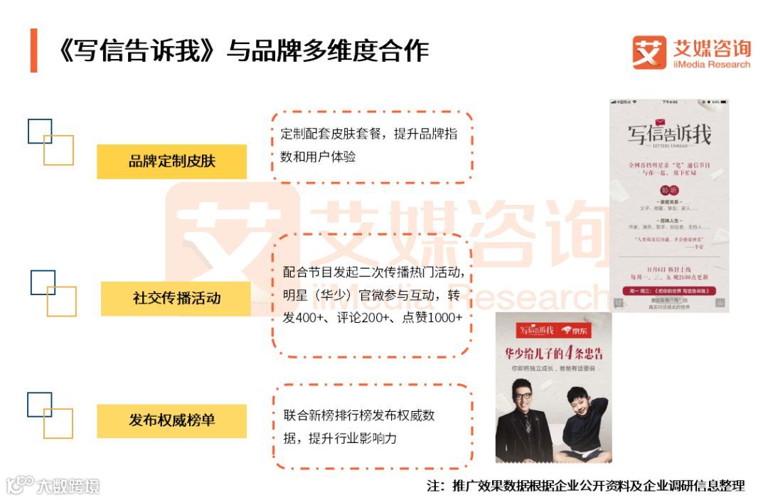 《写信告诉我》是全网首档明星亲“笔”通信节目,节目中嘉宾互相写信,真实对话彼此世界。京东联合喜马拉雅超级IP《写信告诉我》,不仅通过常规广告位进行推广,还联合喜马平台重要内容运营头部资源,利用加权智能向站内同类节目受众进行推送。