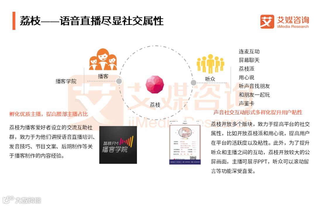 荔枝作为连接播客和听众的工具,旨在提升播客和用户的体验。拥有大量的播客和用户是荔枝的核心竞争力,因此为了培养优质主播,提高腰部主播占比,荔枝设置播客学院,聘请专业主播讲授语音直播培训、发音技巧等经验,为荔枝平台输出大量优质主播资源,提升平台竞争力。荔枝平台增加许多社交功能,比如屏幕聊天、连麦互动等可以实现直播随时交流,此外,荔枝派、听声音找朋友等内容版块增强荔枝平台社交性,声鉴卡的形成提高“玩”的趣味性。