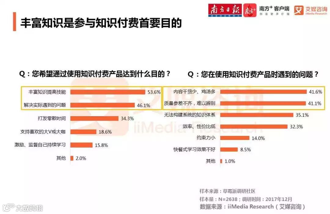 知识付费用户使用知识付费产品主要目的为丰富知识、提高技能与解决问题,四成知识付费用户认为知识付费产品的内容不佳、质量参差不齐。