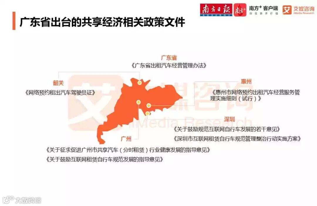 作为新兴经济力量的产业高地,广东省在共享经济领域一直是企业首要布局市场,广东省出台的政策文件主要集中在共享出行领域。其中,深圳规范工作走在前列,已将共享单车立法列入工作计划;广州加强自行车投放管控、鼓励新能源共享汽车发展;惠州、韶关对网约车管理进一步提出规范细则。