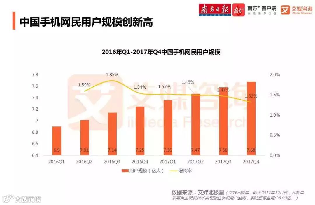 2017年Q4中国手机网民用户规模达到7.68亿人。