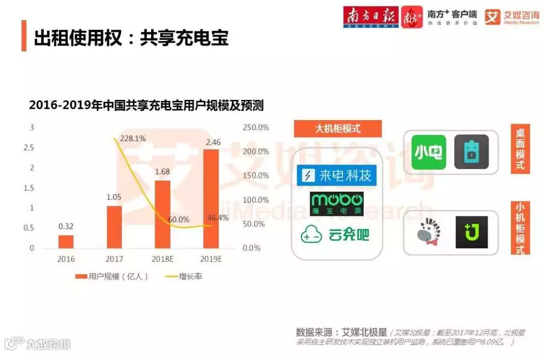 用户规模全面放缓,预计2019年中国共享充电宝用户规模达2.46亿元。