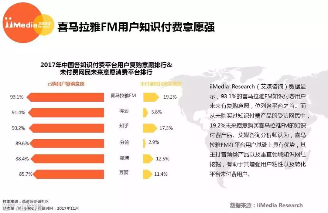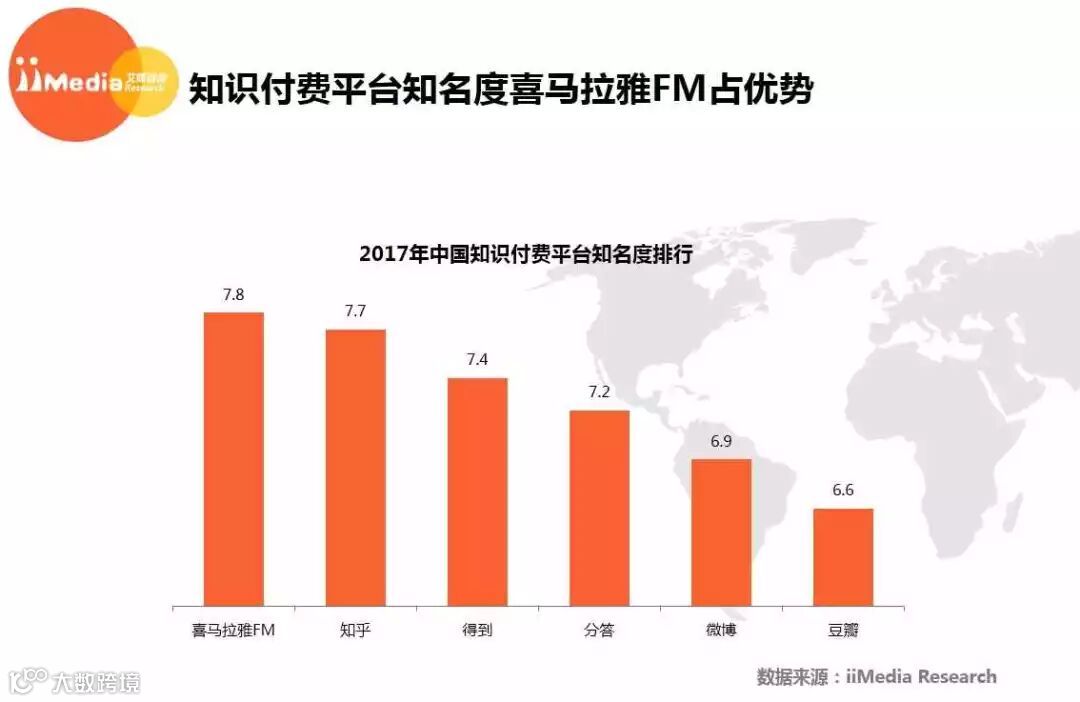 iiMedia Research(艾媒咨询)数据显示,2017年中国知识付费平台知名度排行中,喜马拉雅FM以7.8分排名榜首,知乎则以7.7分紧随其后。艾媒咨询分析师认为,相较于得到跟分答,知乎与喜马拉雅FM在原平台及社区运营上具有优势,拥有深厚的用户基础,而与微博、豆瓣等平台相比,知乎及喜马拉雅FM则拥有先入优势,在知识付费市场上建立其良好口碑。