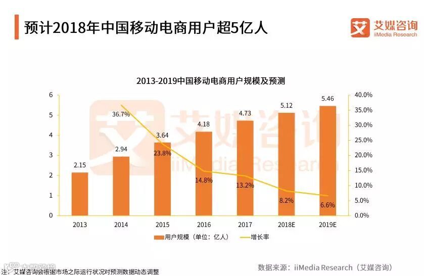 iiMedia Research(艾媒咨询)数据显示,2017年移动电商用户规模达4.73亿人,增长13.2%,2018年预计能增长至5.12亿人。