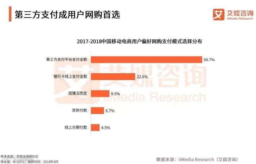 iiMedia Research(艾媒咨询)数据显示,有83.8%的受访中国移动电商用户明确使用线上支付的方式进行付款,其中56.7%使用第三方平台,22.6%使用银行卡。艾媒咨询分析师认为,随着移动支付技术发展以及普及,电商用户使用第三方支付产品进行网民已成不可逆的趋势。