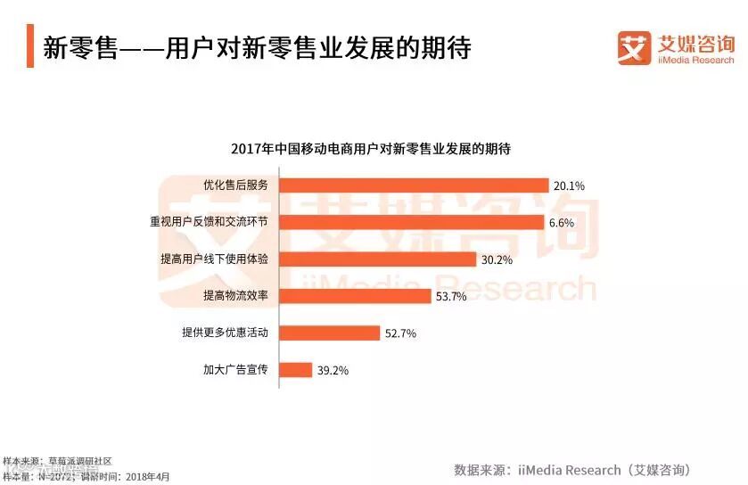iiMedia Research(艾媒咨询)数据显示,对于新零售行业,分别有53.7%和52.7%的受访网民表示希望新零售业能够优化售后服务并且重视用户反馈和交流的环节,除此之外也有较多用户希望提高线下使用体验,提供更多优惠活动。