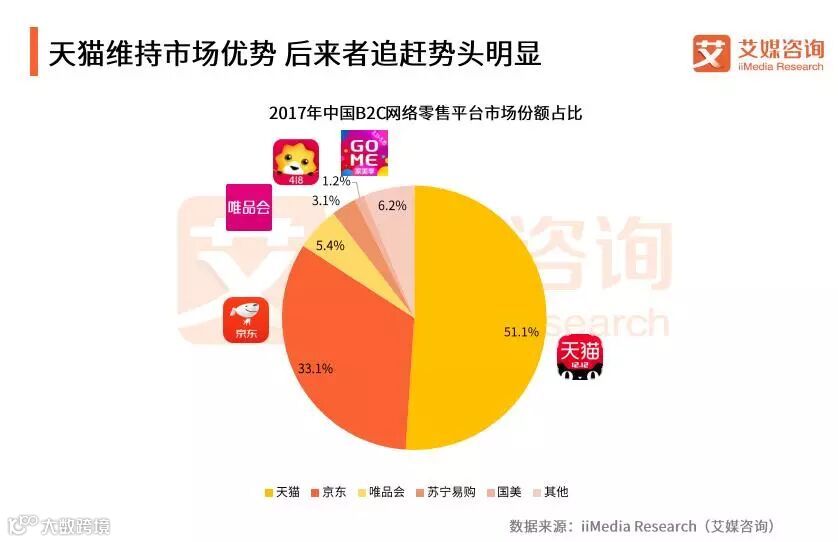 iiMedia Research(艾媒咨询)数据显示,2017年天猫占据中国B2C网络零售平台市场51.1%的份额,领先优势明显。京东和唯品会分别以33.1%及5.4%的市场份额位列其后。艾媒咨询分析师认为,目前中国B2C网络零售市场上,阿里系天猫仍然较其他平台占有较大优势,但随着消费者越来越注重网购商品品质和购物体验,京东、唯品会也保持着较强的追赶势头。