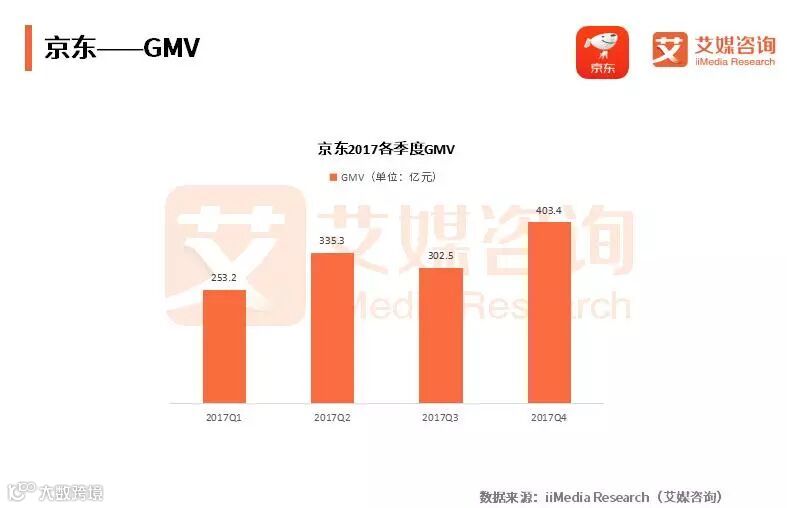 2017年全年京东GMV接近1.3万亿元人民币,得益于京东2017年的新战略布局。京东新战略以采购为主场景,继续加强技术、商品、履约交付、增值服务四大核心能力,此外,京东云、京东金融、京东物流也与企业业务进行绑定,目的是希望借助企业级消费场景,刺激潜在的现金流业务。艾媒咨询分析师认为,新战略体现了京东加大各环节的把握力度,同时重视完善对B端企业的服务。
