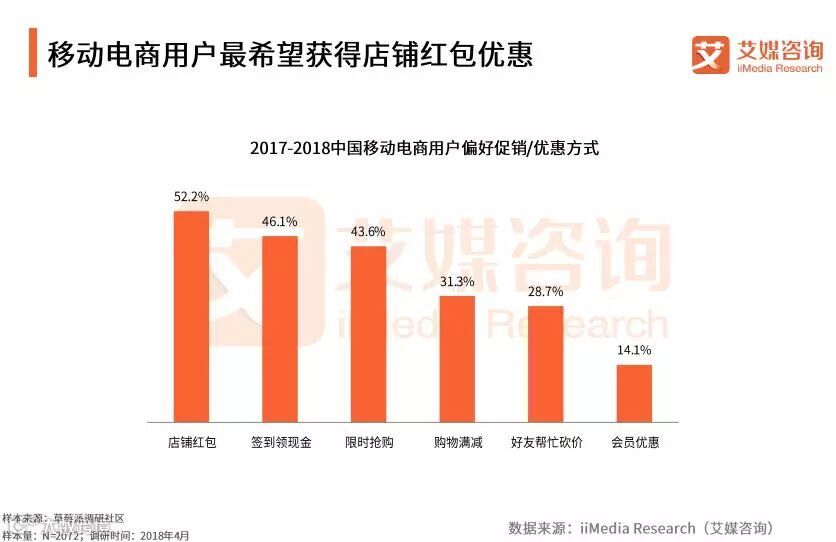 iiMedia Research(艾媒咨询)数据显示,在用户偏好促销/优惠方式方面,店铺红包是用户最希望得到的优惠方式,占比52.2%,其次是签到领现金和限时抢购,分别占比46.1%和43.6%。